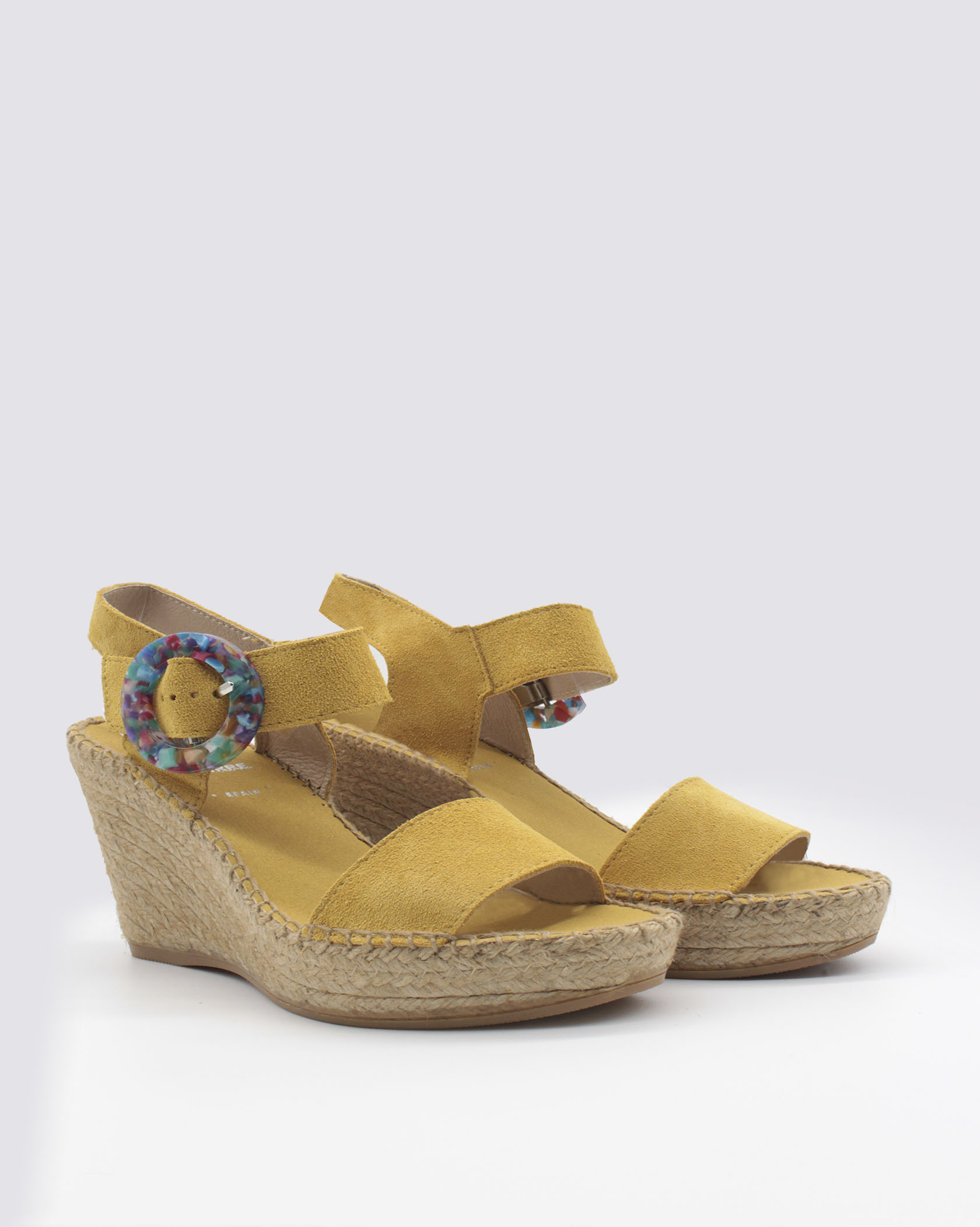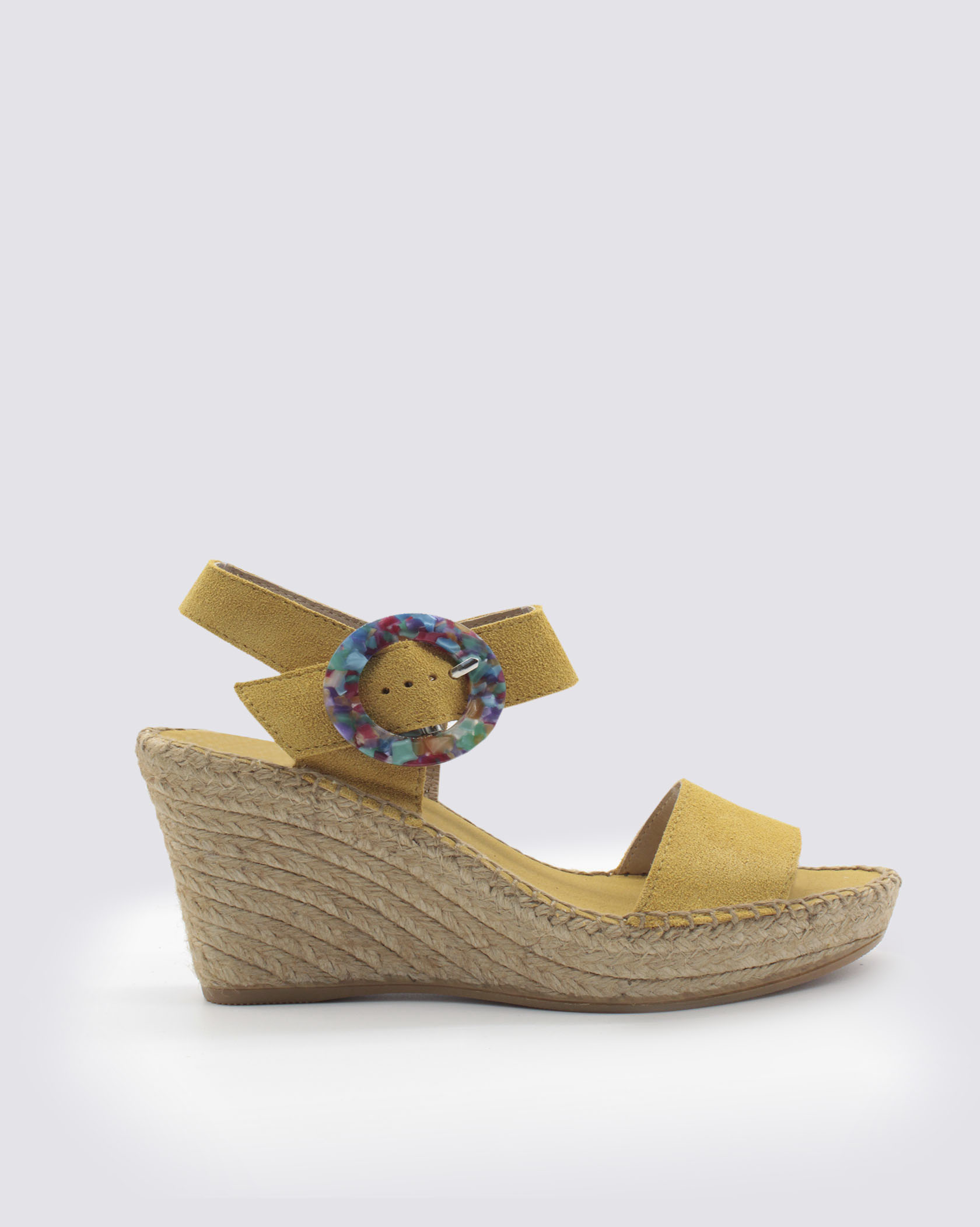 Llena tus días de color y alegría con el modelo ANDESITA MOSTAZA. Esta sandalia amarilla está cosida a mano y tiene una cuña de yute natural de 10 cm. Se ata al tobillo con una hebilla multicolor que le da un toque original. Gracias a su diseño, se ajusta perfectamente a tu pie y podrás llevarlas durante todo el día sin que tus pies se cansen.